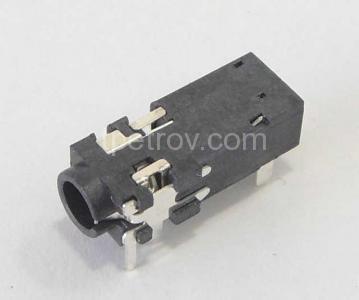 Женски стереожак, гнездо 3.5mm с 4 контактни извода, с два изключвателя за монтаж на печатна платка. Широчина 6.7mm, височина 5mm, дълбочина 17.3mm.