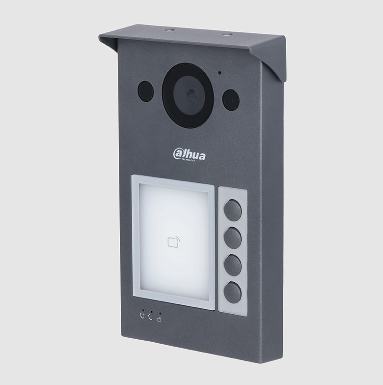 IP Външно вандалоустойчиво видеодомофонно устройство за 4 абоната с 2 Mpix True DayNight TrueWDR 120dB, ICR 1/2.8” CMOS камера с висока светлочувстителност и хоризонтален ъгъл 125º и вградена подсветка. Опция за син и червен лицев панел. Картов четец за IC 13.56Mhz карти, памет за 3000 карти. Ethernet RJ-45 порт 10/100Mps TCP/IP или двупроводна линия. Управление през Android/iOS приложение DMSS Plus. Дистанционно отваряне на врата. 1x вход за exit бутон, 1x вход за статус, 1x RS485. 1x Слот за MicroSD карта до 256GB. Протоколи: SIP2.0, TCP/IP, компресия H.264/G.711. Захранване DC48V/1A, POE 802.3af или комутатор за двупроводна линия. Работна температура: -40~60ºC. Подходящ за повърхностен монтаж. Водо и вандалоустойчив алуминиев корпус, IP65(С допълнително силиконизиране)/IK08. Размери: 188.1 mm × 107.2 mm × 30 mm.