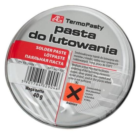 Паста за запояване AGT-037 40g с колофонов флюс с работна температура до 350C. Подходяща за запояване на медни, посребрени, поцинковани и никелирани елементи.